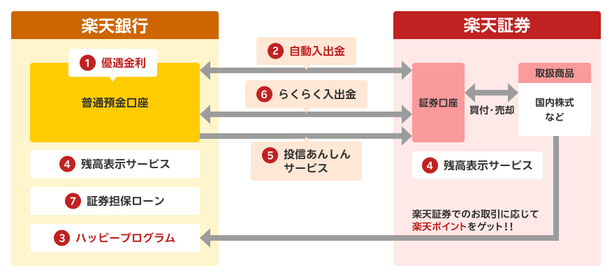 取扱業務 「楽天証券株式会社」は、「楽天銀行株式会社」を所属銀行とする銀行代理業者として、「円貨普通預金口座開設の媒介(勧誘および受付)」および「資金の貸付を内容とする契約の媒介」を行ないます。また、銀行代理行為に関してお客様から金銭その他の財産の交付を受けることはありません。