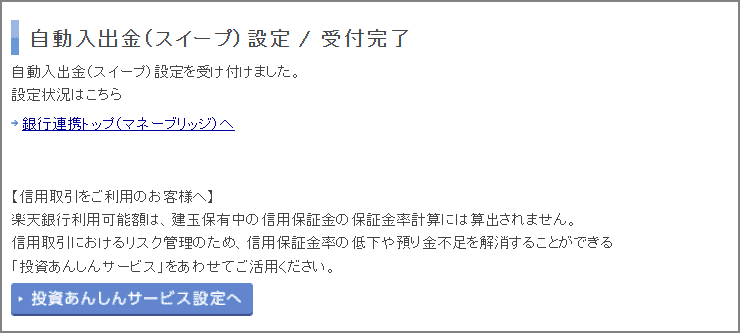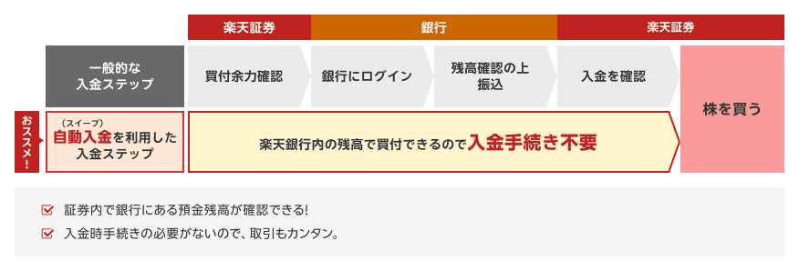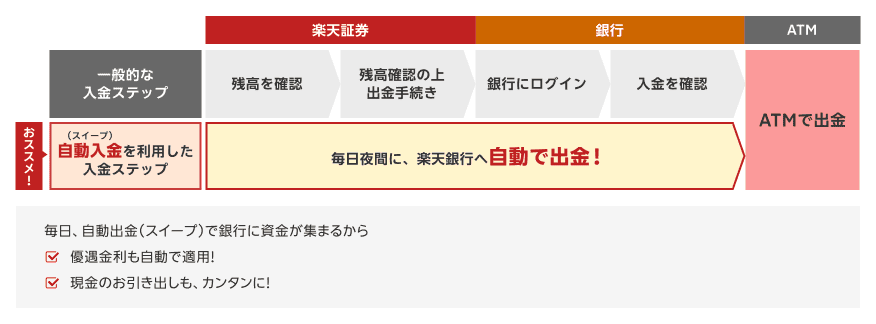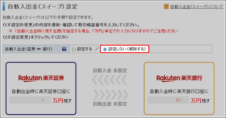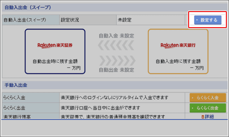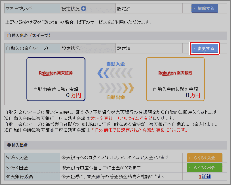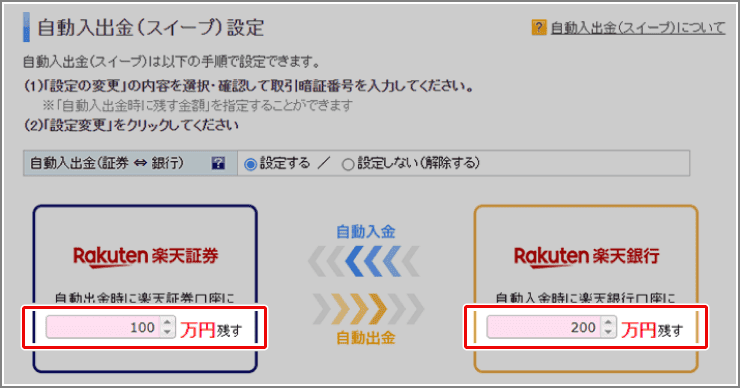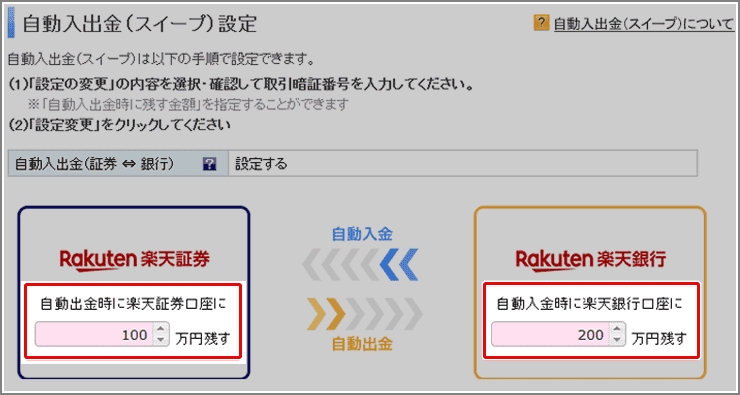 自動入出金(スイープ)とは楽天銀行と楽天証券の資金移動サービスです。