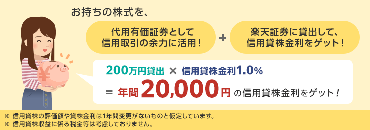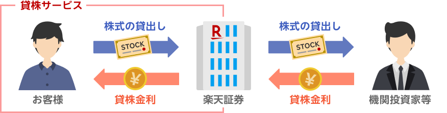 「信用貸株®」とは、信用取引の代用有価証券として利用している株式を楽天証券に貸し出して貸株金利を受け取ることができるしくみです。