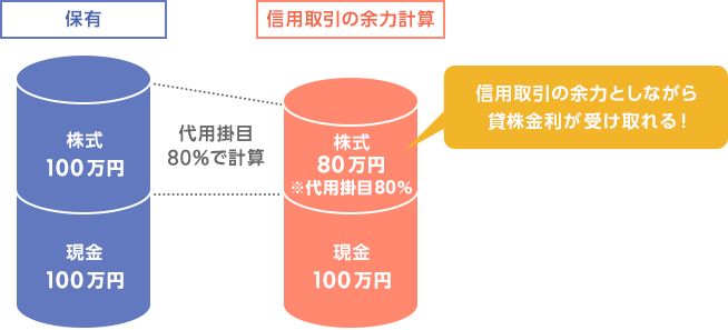 「信用貸株®」を利用し、貸出し中の株式についても同様に、80%相当額を保証金とみなして信用取引の余力計算を行います。貸株金利を得られるからと言って代用評価の掛け目に変更はありません。