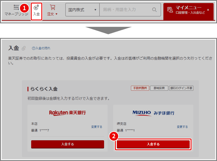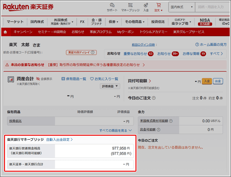 楽天証券のログイン後トップ画面・らくらく入金画面に、楽天銀行口座の普通預金残高が表示されます。