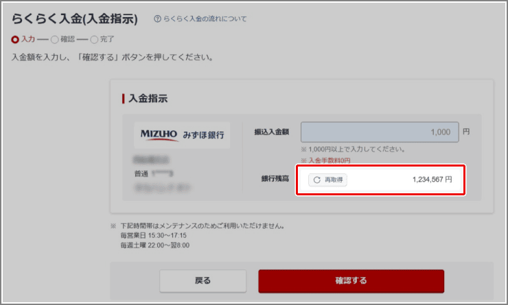 らくらく入金(入金指示)画面にみずほ銀行口座の普通預金残高が表示されます。