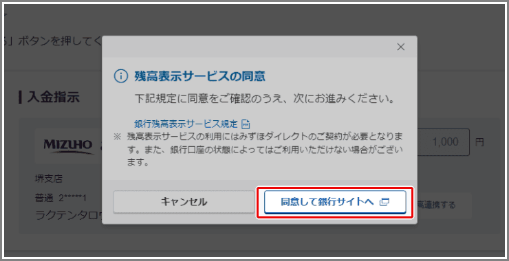 「同意して銀行サイトへ」をクリックすると、みずほダイレクトのサイトへ遷移します。画面の指示に従い登録を完了してください。