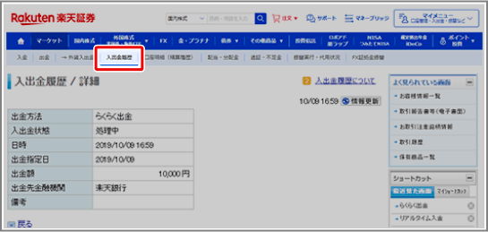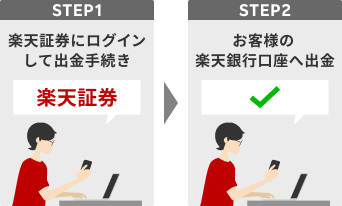 らくらく出金とは楽天証券口座から楽天銀行口座、みずほ銀行口座に即日出金ができるサービスです。