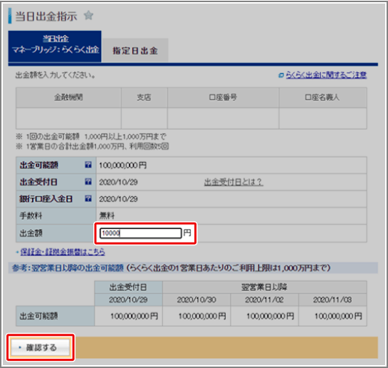| 出金可能額 | 1回の出金可能額 1,000円以上1,000万円まで 1営業日の合計出金金額 1,000万円まで |