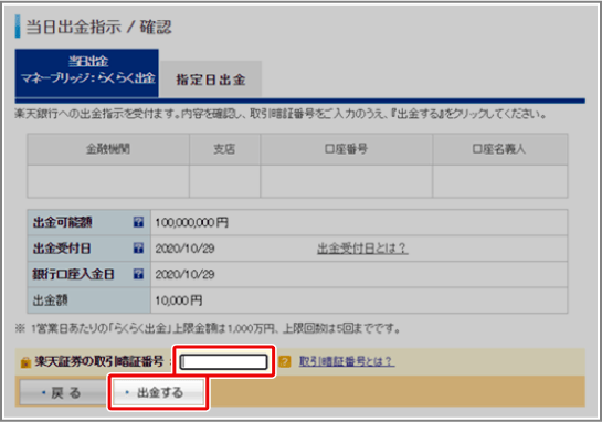 楽天証券の取引暗証番号を入力し、「出金する」ボタンをクリック。