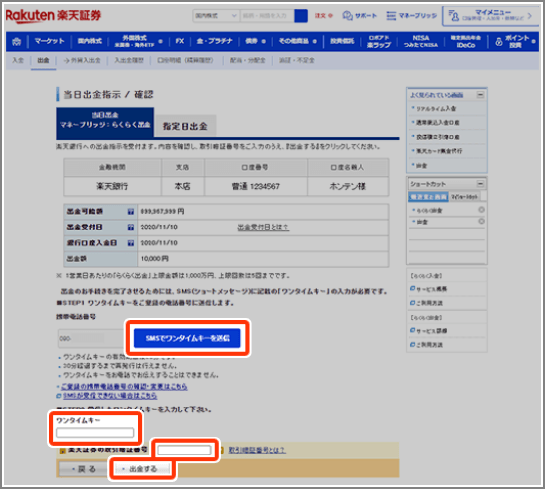 「SMSでワンタイムキーを送信」をクリック後、ワンタイムキーと楽天証券の取引暗証番号を入力し、「出金する」ボタンをクリックしてください。