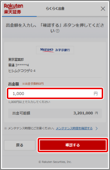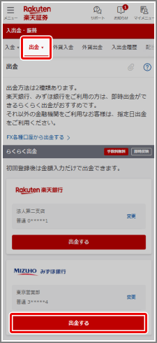 | 出金方法 | 「マイメニュー」→入出金・振替「出金」→「らくらく出金(みずほ銀行)へ進む」から画面操作。