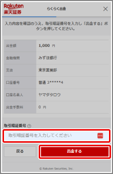 楽天証券の暗証番号入力後、「出金する」ボタンをクリックします。